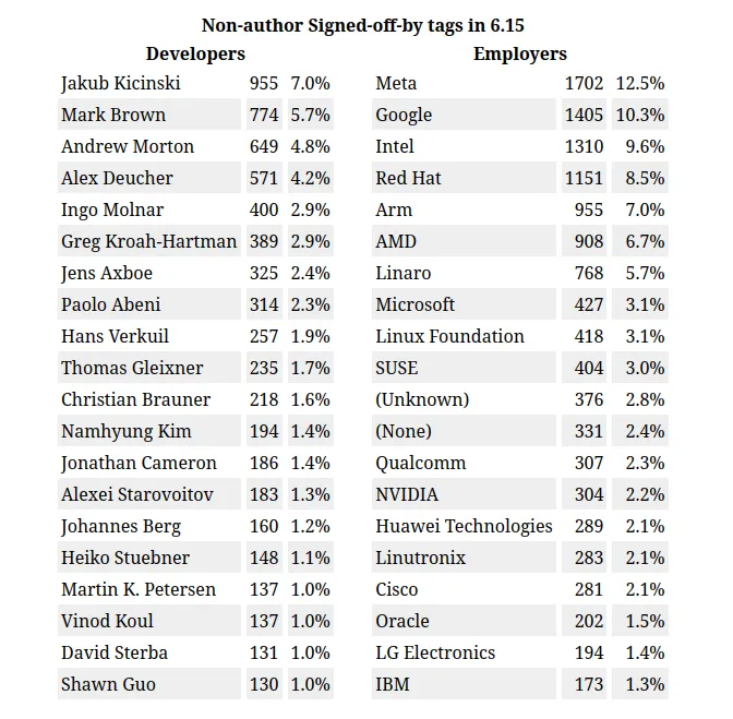 Statistical analyses of kernel development often highlight the contributions of top maintainers, identifying those who consistently add their Signed-off-by: line when applying patches. It is noteworthy that Linaro, a leading open-source software engineering organization, frequently features among the top 10 employers for kernel maintainers, underscoring its significant contributions to the Linux ecosystem.