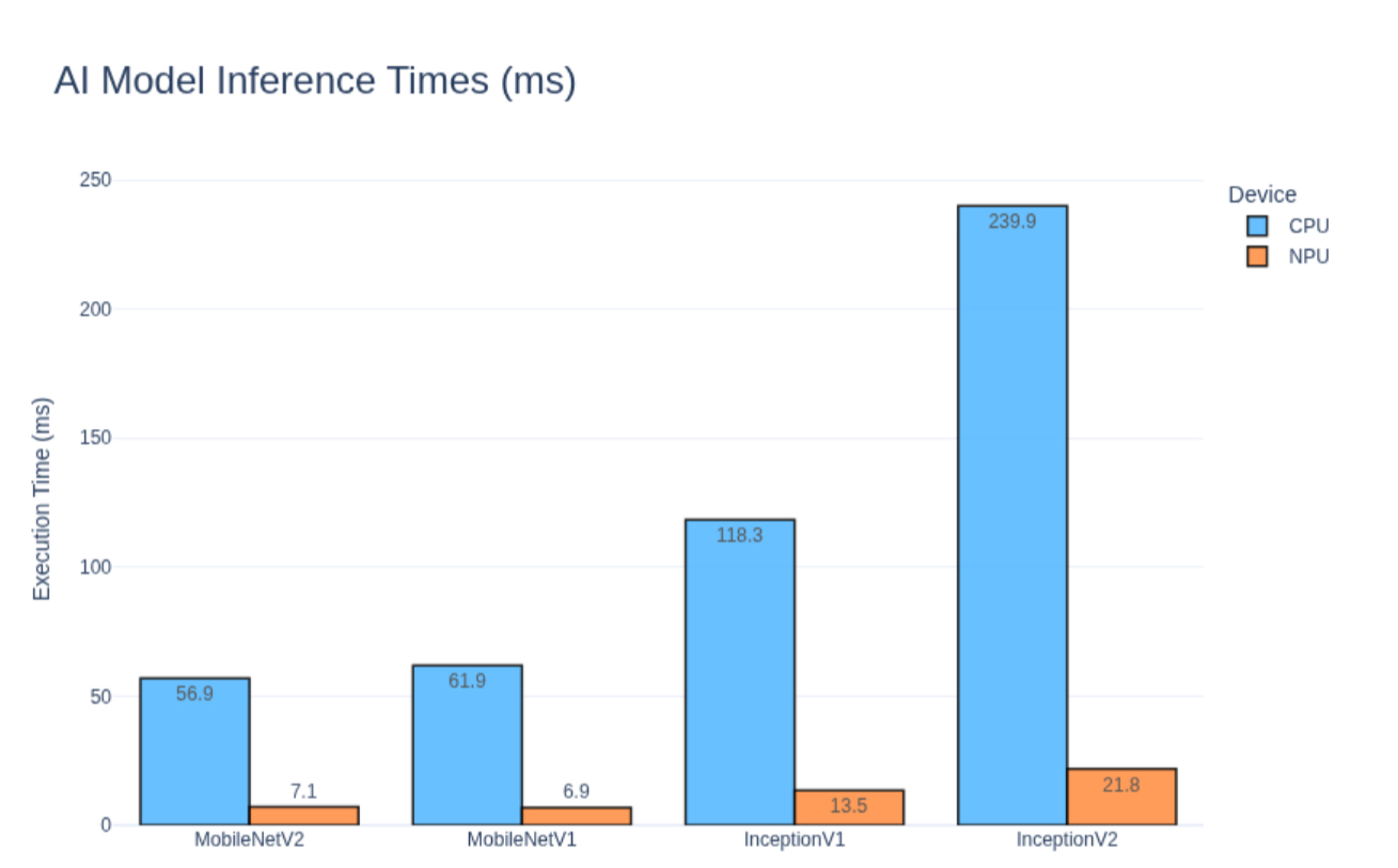 MobileNet V2 and Inception V2 fall between these two extremes, offering a trade-off between latency and speedup. Across these models, we did not observe any difference in prediction accuracy between CPU and NPU execution. The outputs were consistent for the tested inputs.