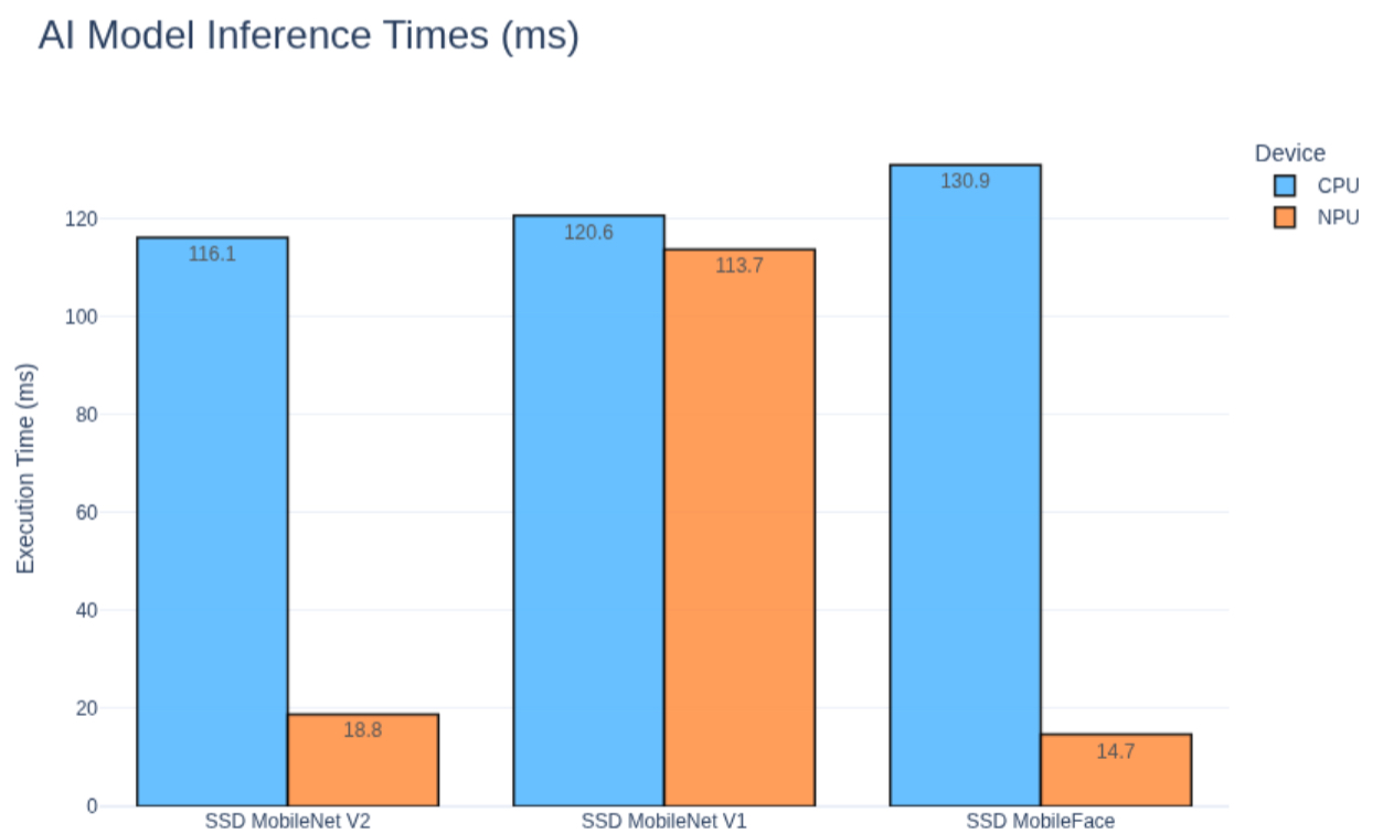 SSD MobileNet V2 is the only object detection model that works reliably on the NPU and provides a clear performance benefit. SSD MobileNet V1 can execute on the NPU, but the results are misleading. Latency is close to CPU execution and the model produces incorrect detections, which makes it impractical to use in its current form. This happens because MobileNet V1 falls back to the CPU a lot.