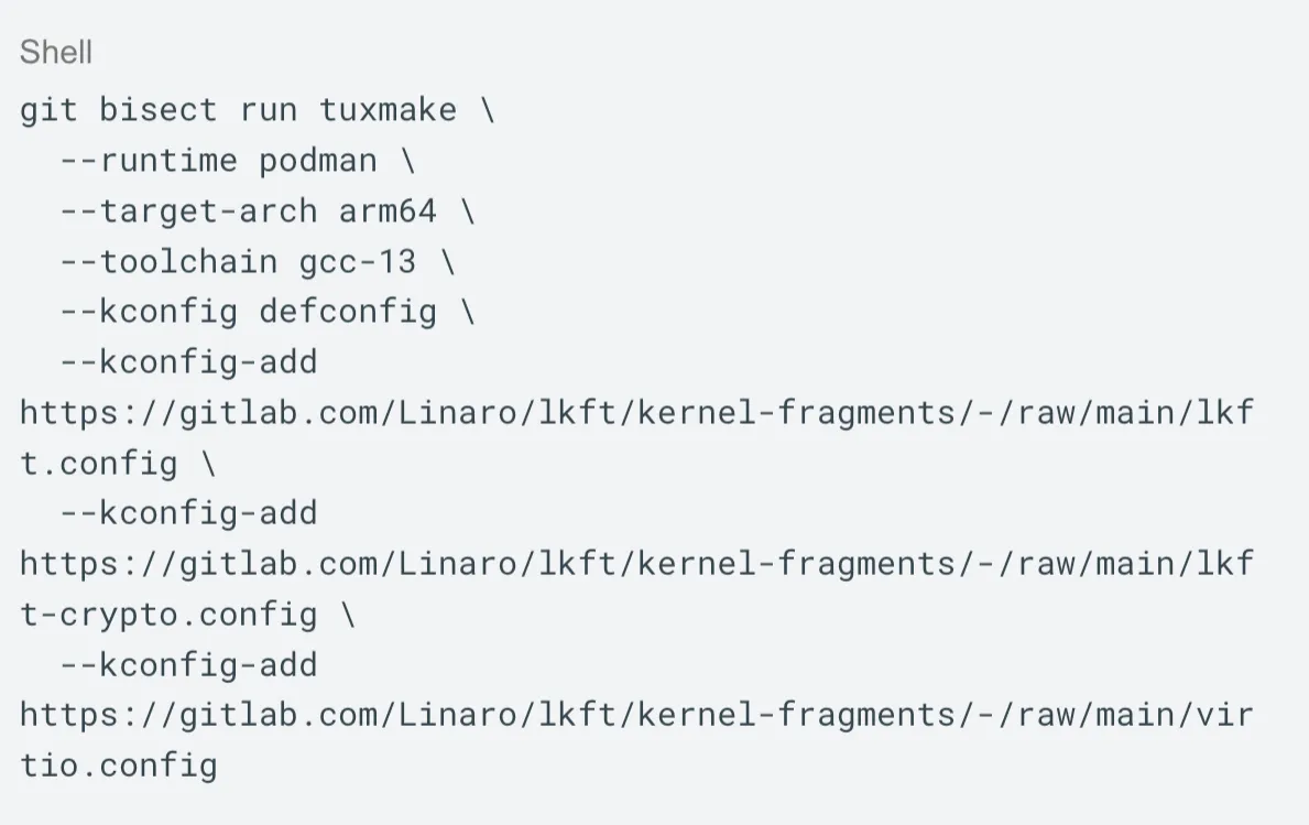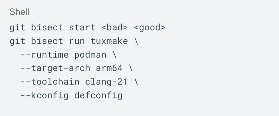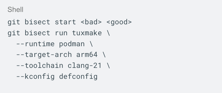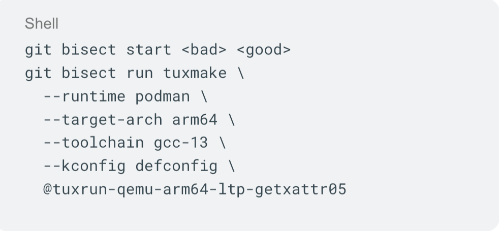 With TuxMake and TuxRun, the compiler, configuration, runtime, and test setup are part of the command itself. The same command can be shared and rerun by reviewers or maintainers without guessing toolchain version or runtime details. This keeps the discussion focused on the regression and usually makes it faster to reach a fix.